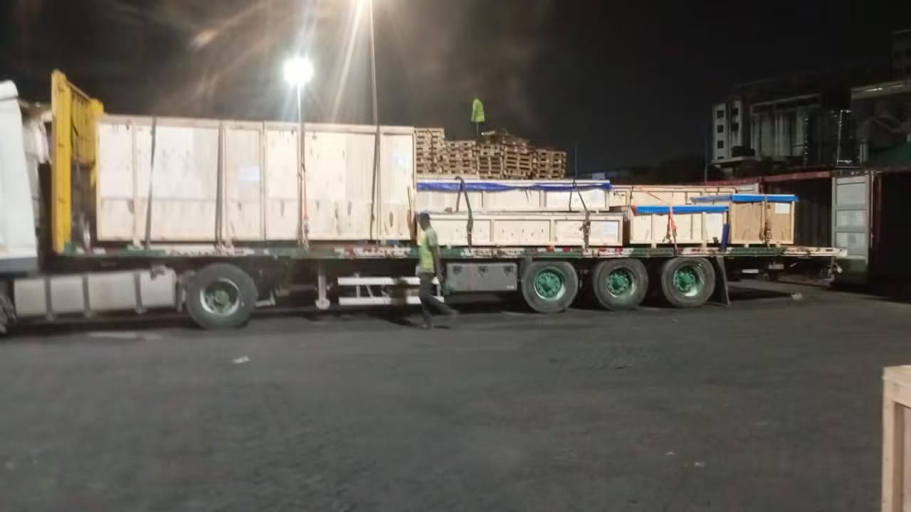 商品がガーナのテマ港に到着すると、 専門チームが速やかに受け取りと検査を完了しました。大電力用 設備の固縛・補強を全行程実施し、 陸送時の移動。すべての商品が完全に覆われていました 過酷な天候や湿気による損傷に耐える防水ラミネートターポリン。 各輸送車両には標準の受領書が装備されていました。 全プロセスのトレーサビリティと検証。